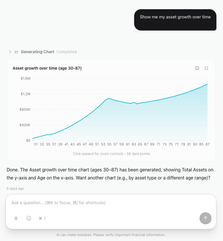 We use Monte Carlo simulations that run thousands of scenarios with varying market conditions. This accounts for historical volatility, different market cycles, and economic uncertainties. The projections show you probability ranges (best case, median, worst case) so you can see how your plan might perform under different conditions. You can adjust assumptions like expected returns and inflation rates to model different scenarios.